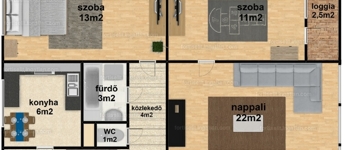 Az ingatlanba belépve a gépesített konyhába érkezünk, ahonnan a lakás körbejárható. A folyosóról külön helyiségben található a fürdőszoba és a WC, ami praktikus megoldást jelent a mindennapokban. A három szoba nagyméretű, jól bútorozható, a nappali déli fekvésének köszönhetően nagyon világos, kellemes hangulatot áraszt.Illetve az egyik szobából egy kis loggia is nyílik.