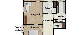 -75m2-es lakás(2 szoba, fürdőszoba, wc, nappali, konyha, kamra, közlekedő és egy gardrób)