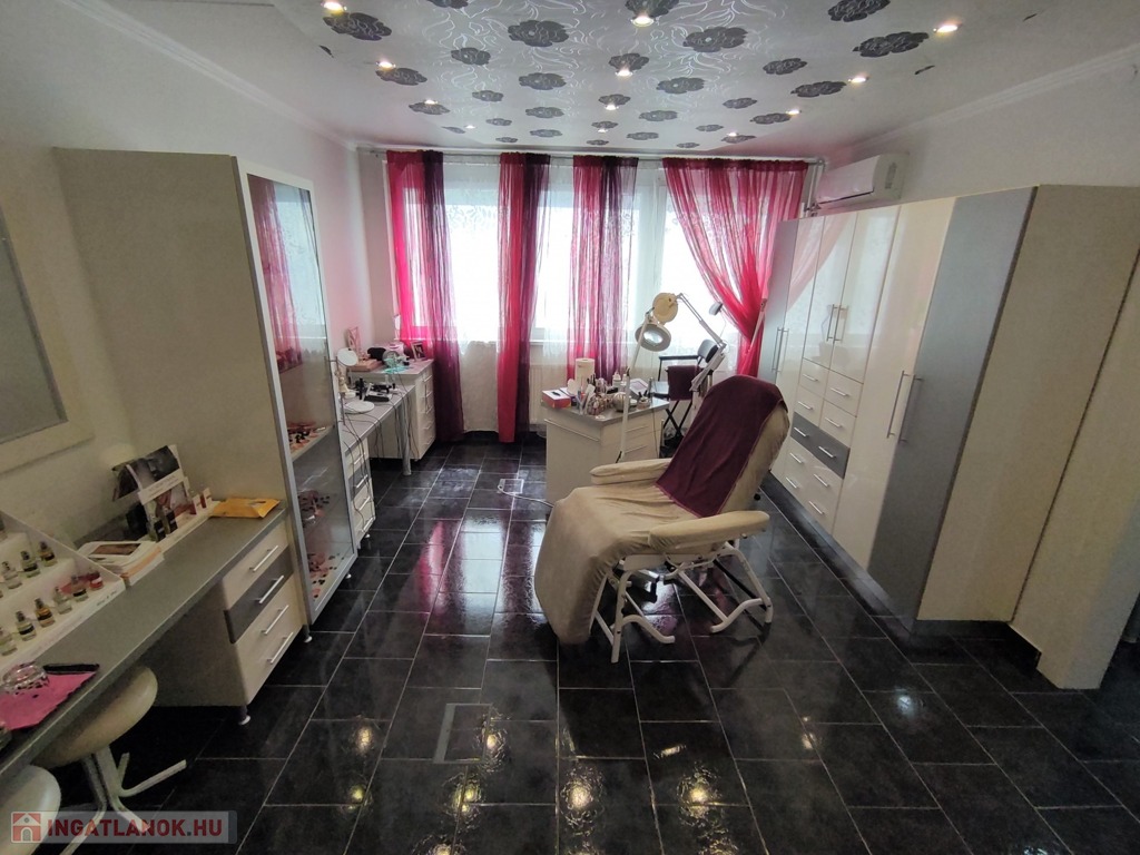 A lakásba a biztonsági bejárati ajtón juthatunk be. A nyílászárók mindenhol modern típusú műanyagra lettek cserélve. A tulajdonos az évek alatt több mindent felújított, klímával felszerelte az ingatlant. A szobák elrendezését tekintve kitűnő elosztásúak, a nappali DK-ti tájolású. Az ingatlan jelenleg szépségszalonnak lett kialakítva (akár gépesítve is átvehető), de lakásnak is alkalmas. Igényes járólap burkolattal lett kialakítva minden helyiség. A bejárattól az ablakos tágas 9,25 nm-es konyhába érkezünk meg. A 4,5 nm-es közlekedőn keresztül jutunk az ingatlan többi részébe. Az igényes járólap burkolatú előszobából jobbra a Wc és a 2,5 nm-es zuhanyzós fürdőt találjuk. Innen nyílik a 14 nm-es, nagy ablakos csempe burkolatú szoba nyílik. A közlekedőn egyenesen haladva a szintén járólap burkolatú, több mint 22 nm-es nappaliba lépünk, innen nyílik a 13 nm-es kisebb szintén járólap burkolatú szoba, ami eredetileg erkélyes volt, de beépítették. Az üzlethelyiség/lakás nagyon szép állapotú, többféle képpen át lehet alakítani. A lakás a D-i, DK-i fekvése miatt kedvező fényviszonyok jellemzik.
