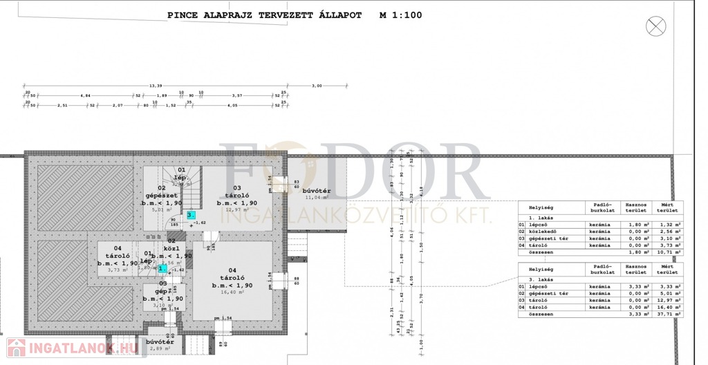 • Extrák: saját pincerész + lépcsőház + közlekedő + tároló (össz.: 10,71 m²)