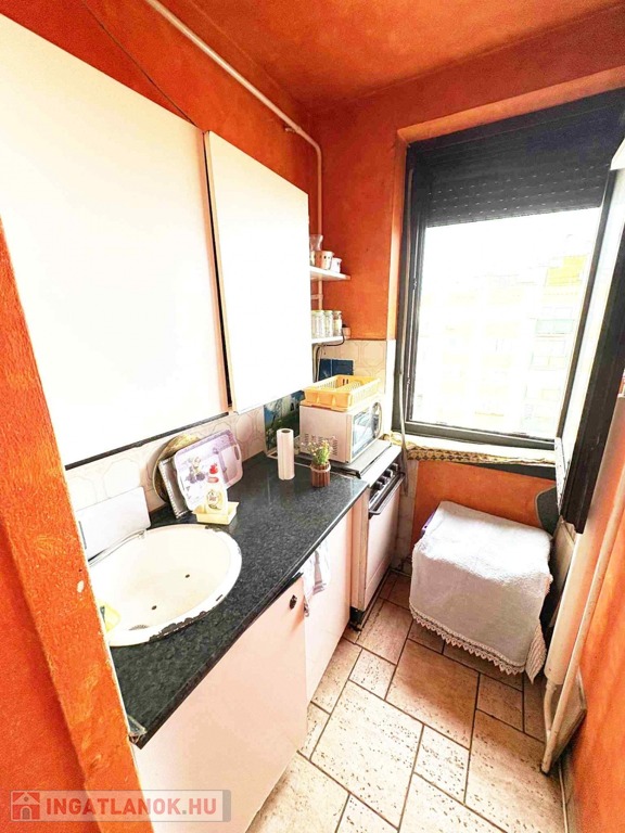 Budapest XV. kerületének közkedvelt részén, a Csobogós utcai lakótelepen, eladó egy 10. emeleti, felújítandó állapotú, 1+1 félszobás, rendkívül világos, ablakoskonyhás 34 négyzetméteres panellakás.