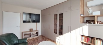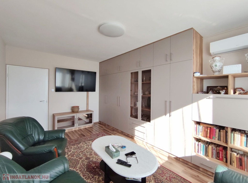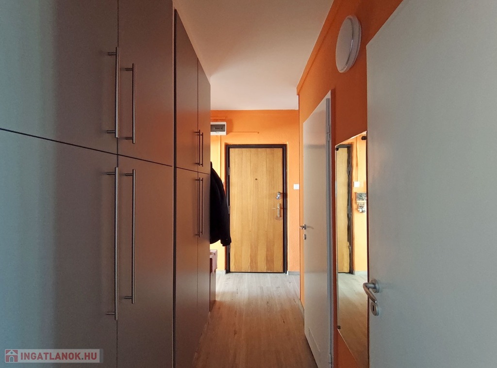 A bejárati ajtón belépve a vinyl burkolatú előszobában közvetlenül jobb kéz felől az új, modern, minőségi parkettával burkolt, tágas, világos, parkra néző, 18,4 nm-es, műanyag ablakos, redőnyös, új, minőségi LG márkájú klímával szerelt nappaliba jutunk. A nappaliban vadonatúj, asztalos által egyedileg gyártott, esztétikus, faltól-falig, valamint a mennyezetig beépített szekrénysor került beépítésre. A szekrénysor beépítésével, a nappaliból a hálóba nyíló ajtó lezárásra került. Az „L” alakú közlekedőben szemben nyílik a 12,8 nm-es, szintén új, minőségi parketta burkolatú, új, minőségi HISENSE márkájú klímával szerelt, műanyag ablakos, szúnyoghálós és redőnyös szoba, és ebből a szobából tudunk a 10,5 nm-es, szintén új, parkettás, műanyag ablakos hálószobába jutni, mely a 2,8 nm-es, redőnyös és szúnyoghálóval szerelt loggiában végződik. A bejárathoz visszamenve a közlekedőben balra haladva jutunk a járólapos, műanyag ablakos, redőnyös, nagyon világos 6,3 nm-es, mennyezetig érő, teljesen új, gépesített, MORA márkájú 4 gázlángos és légkeveréses, villanysűtős tűzhelyes, új gránit mosogatóval is beépített konyhába. A konyhából visszahaladva, balra találjuk a külön nyíló, új, 3D hatású, modern csempével burkolt, közepes állapotú, 2 nm-es fürdőszobát, mellette pedig a szintén minden elemében új, járólapos toalettet.