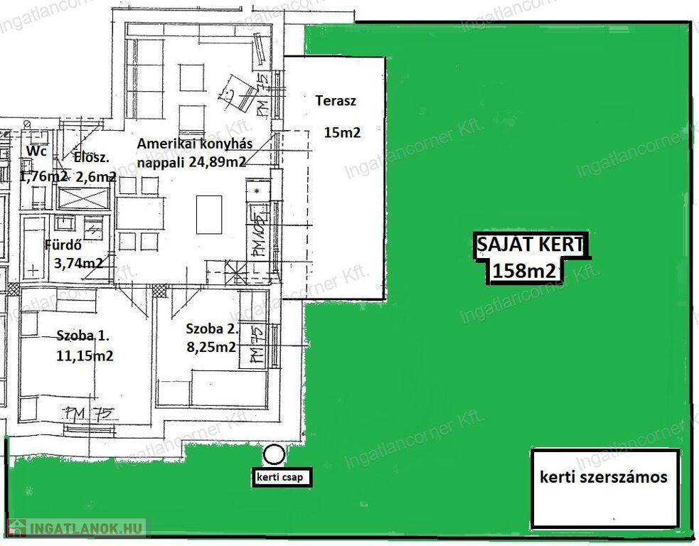 •KERTBEN MEGTALÁLHATÓ: fa szerkezetű 2 x 3 méteres mindent elnyelő KERTI SZERSZÁMOS, szalonnasütő hely, a sütögetéshez szükséges fedett fa tároló.