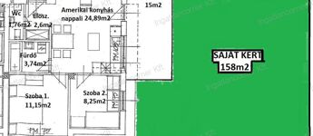 hálószoba (11,15m2, 8,25m2), kényelmes méretű kádas fürdőszoba (3,74m2).