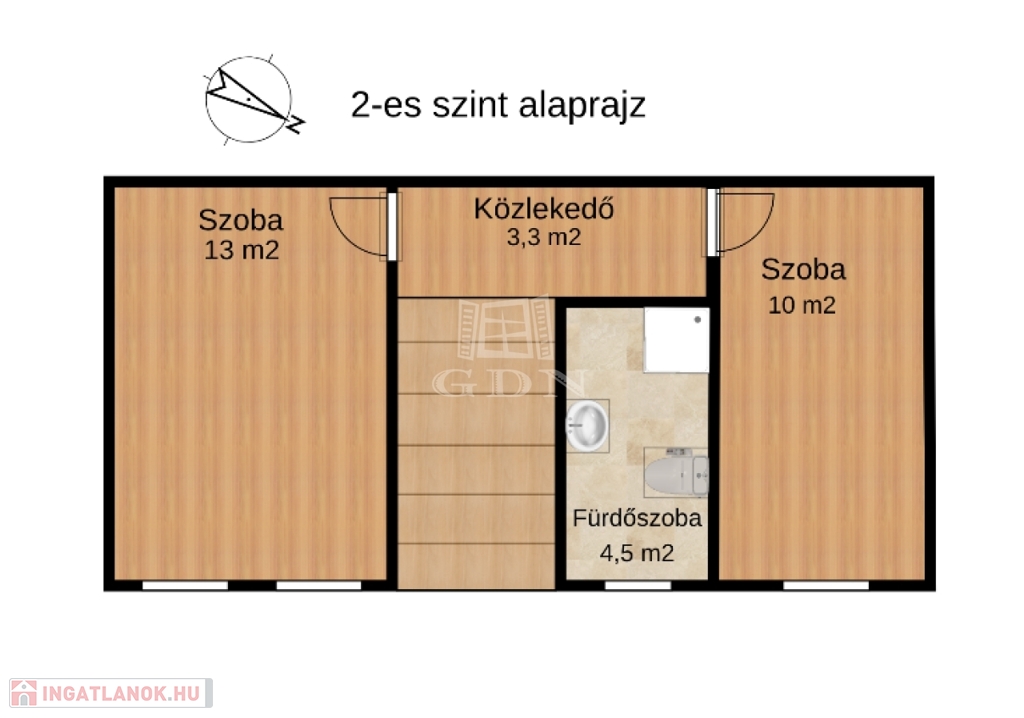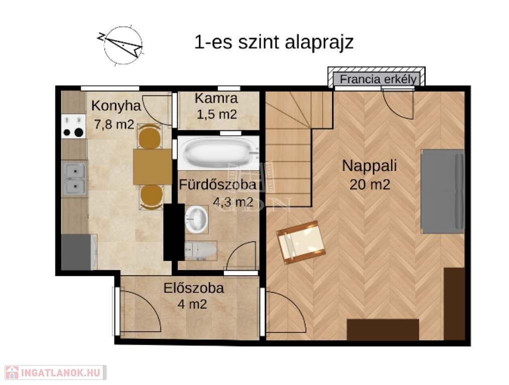 - Földszint: konyha, kamra, fürdőszoba, tágas nappali