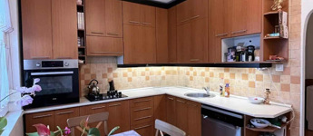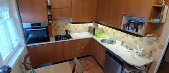 Konyha és fürdő: beépített bútorok, főzőlap, sütő, mosógép; felújított, stílusos fürdő