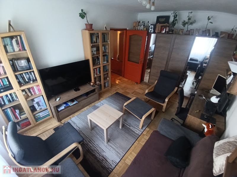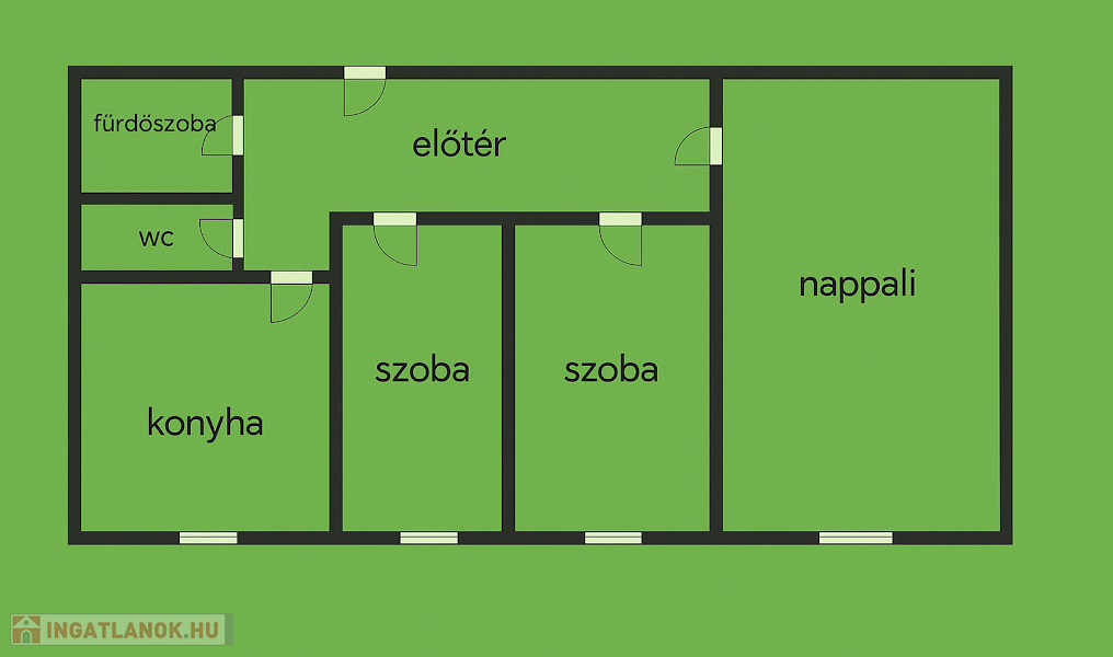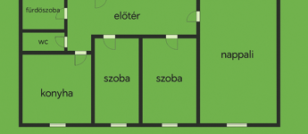 Elrendezés: előtér, két kisebb szoba egymással párhuzamosan, tágas nappali, konyha, fürdőszoba és külön WC.