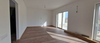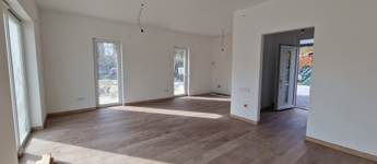 Az ikerház utcafronthoz közelebbi fele már elkelt, az eladásra kínált lakás kellő mértékben elkülönül a másik lakástól és az utcától.