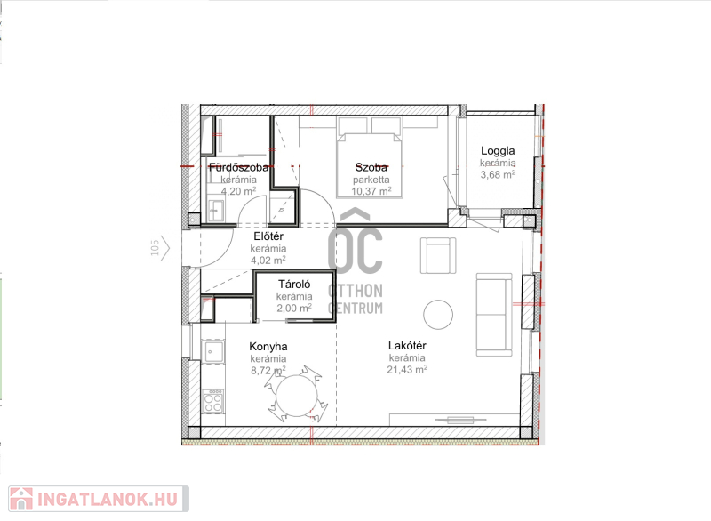 Ez az 1. emeleti lakás 50,74 nm-es, nappali-étkező-konyha +1 szobás, 3,68 nm-es loggiával. Nappali+ 2 szobássá alakítható.