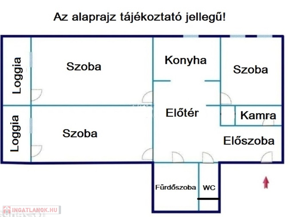 - Az ingatlan helyiségei: előszoba, 3 külön nyíló szoba, konyha, kamra, fürdőszoba, WC külön.