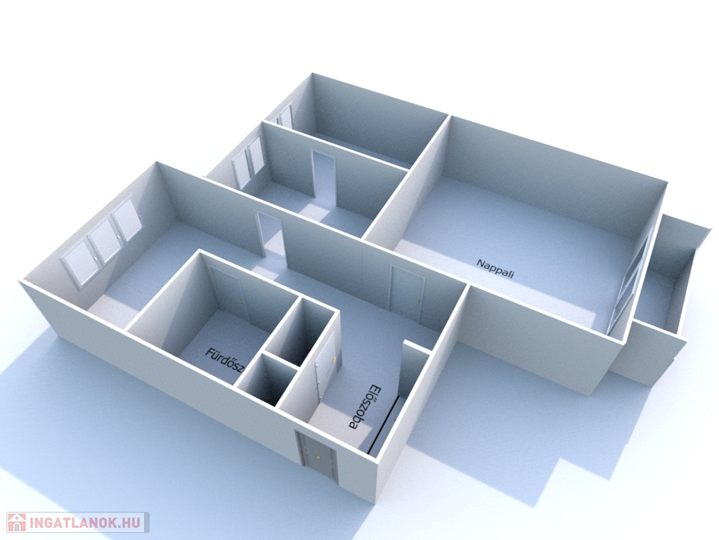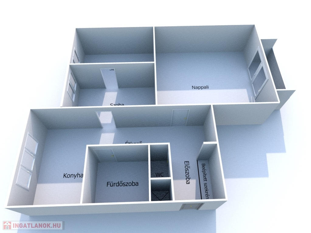 - Helyiségei: előszoba, konyha, étkező, spájz, nappali + 2 szoba, fürdőszoba, WC külön.