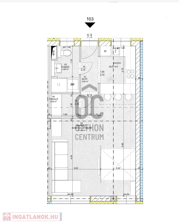 Ez az 1. emeleti lakás 40,25 nm-es, nappali-étkező-konyhás.