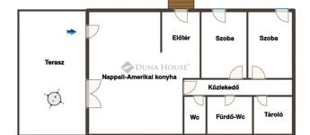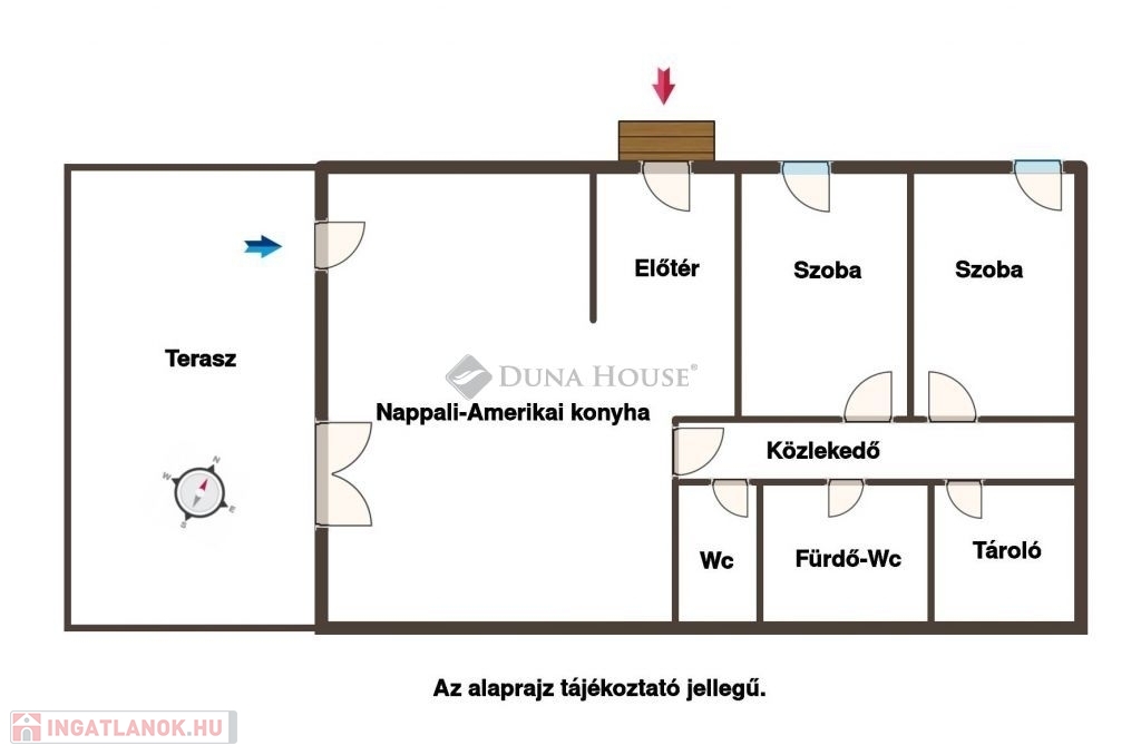 A helyiségeket tekintve nappali-amerikai konyha és két hálószoba, külön fürdőszoba és Wc elrendezésű az ingatlan.