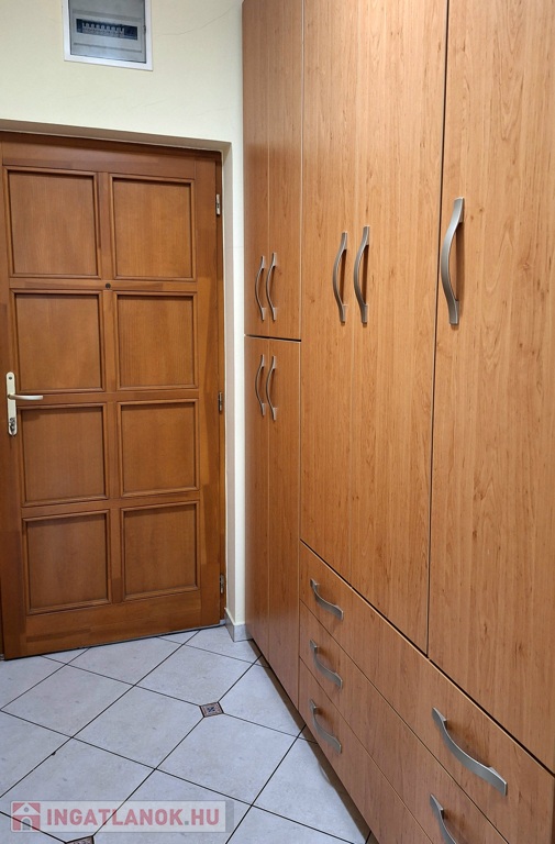 A közlekedőben található plafonig érő beépített gardróbszekrények rengeteg ruha tárolására alkalmasak.