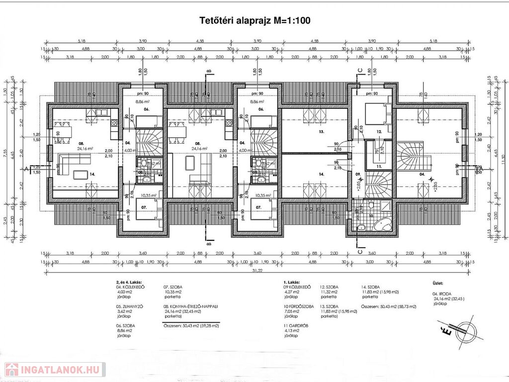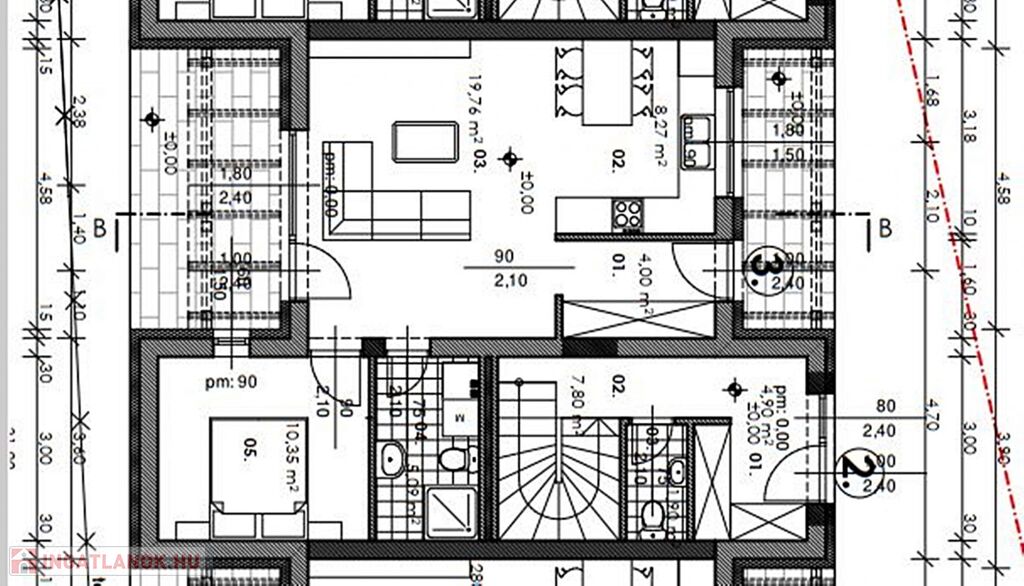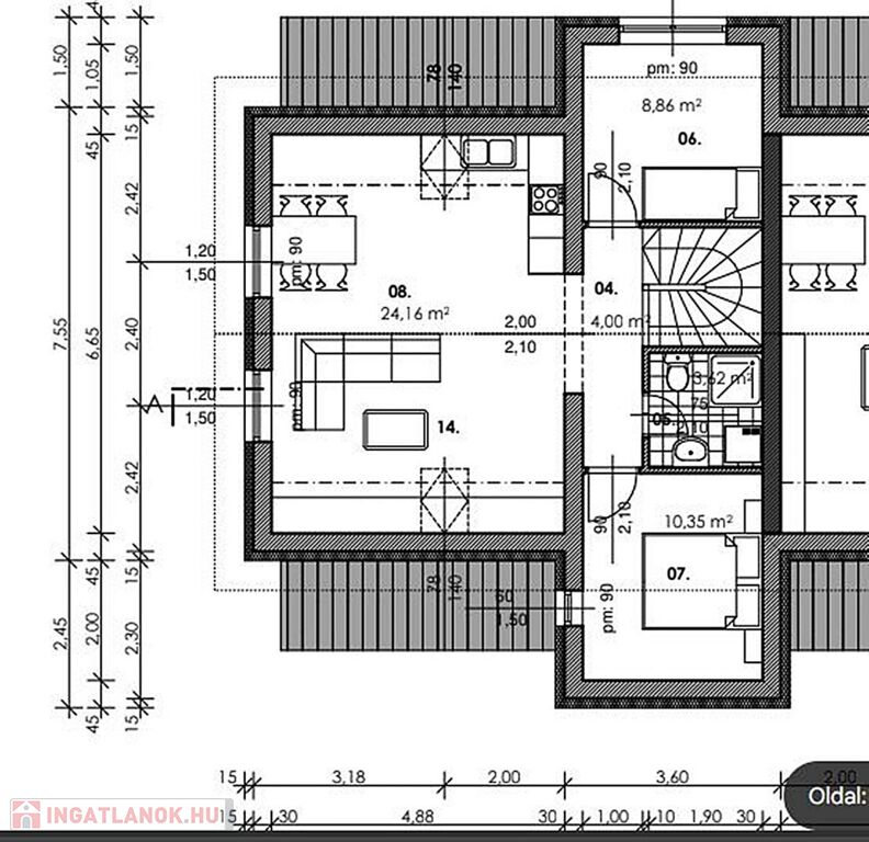 Emelet: amerikai konyhás nappali 24,16 m2, hálószoba 10,35 m2, hálószoba 8,86 m2, fürdőszoba 3,62 m2, közlekedő 4 m2