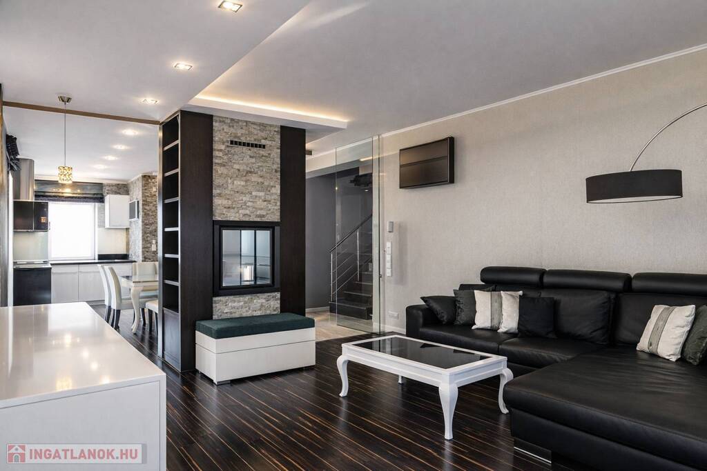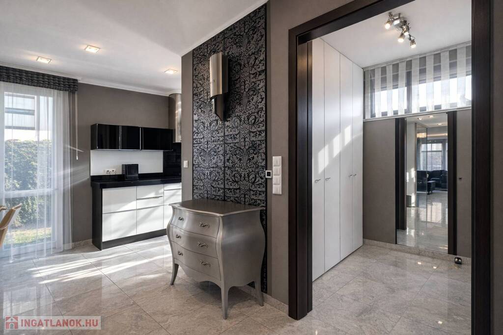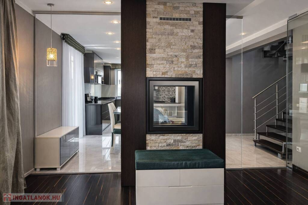 A lakberendező által megálmodott enteriőrben az olasz és spanyol bútorok, az egyedi beépített megoldások, a látványkandalló és az üvegfalak különleges, mégis harmonikus atmoszférát teremtenek. A nappaliból és az étkezőből közvetlen kapcsolat nyílik a térkővel burkolt teraszra és a parkosított, öntözőrendszerrel kiépített, kb. 80 m²-es, intim udvarra – tökéletes helyszín nyugodt, privát kikapcsolódáshoz