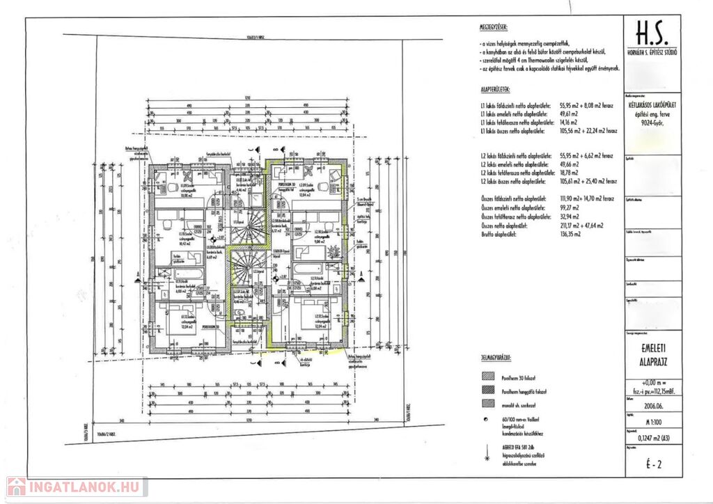 1. EMELET: közlekedő, hálószoba gardróbbal, további szoba, fürdőkádas, duplamosdós fürdőszoba, külön WC, mosógéppel