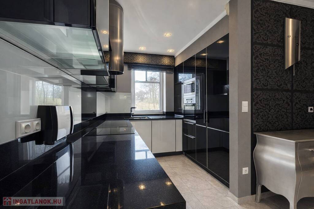 - Egyedi olasz konyhabútor üveg frontlapokkal, fekete gránit pulttal, beépített háztartási gépekkel