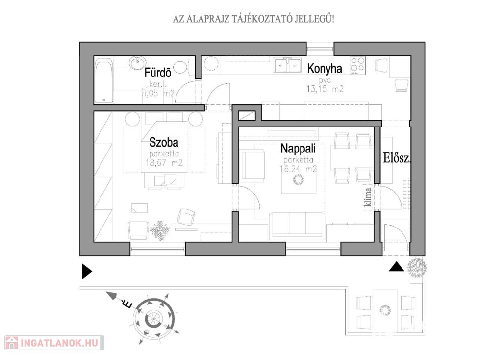 Az ingatlanhoz tartozik egy kis burkolt lekerített terasz, és saját udvari tároló.