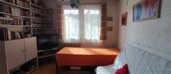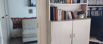 A kicsiszobában szőnyegpadló van és házilag beépített, bútorlapból készült szekrény, ami nem ér a plafonig,