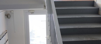 A lépcsőházból keletre és nyugatra is van kijárat. Kaputelefon csak a keleti oldalon van, a nyugati oldalon