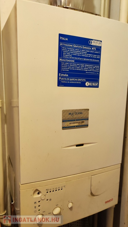 A fűtést és a melegvízet kombinált cirkó gázkazán adja, ami az előszobában van, az egyik képen látható. A gázkazán nem régi.