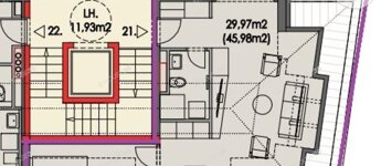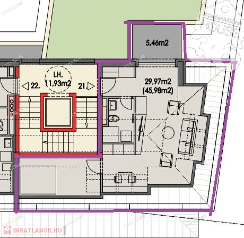 Az épület III. emeletén, bruttó 45,98 m2, nettó 29,97 m2 lakóterű, nappali + 1 szobás lakás, 5,46 m2 erkéllyel megvásárolható.