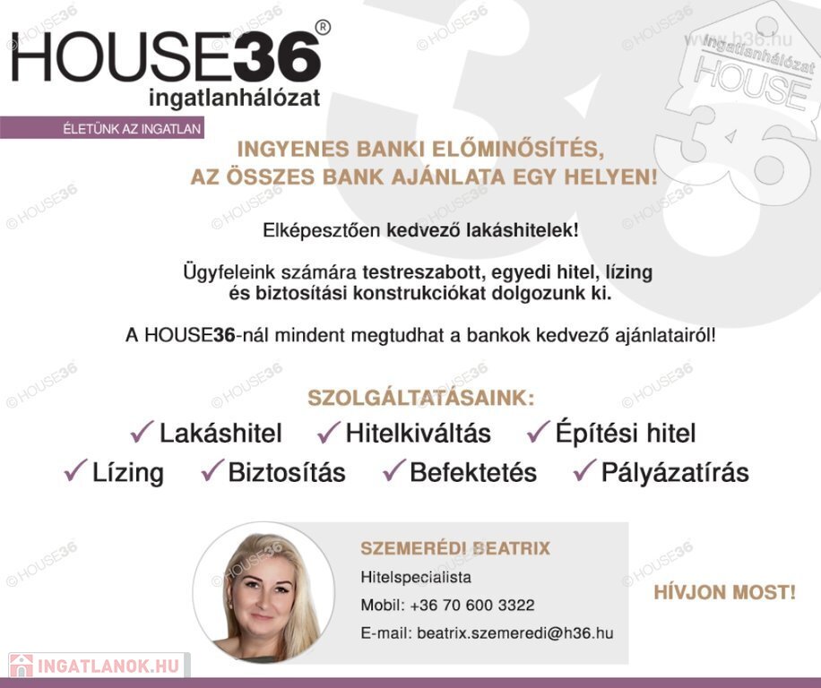 A HOUSE36 kínálatában található összes ingatlannal kapcsolatban tudok felvilágosítást nyújtani! Hívjon bizalommal! Szolgáltatásaink Kereső Ügyfelek számára INGYENESEK!
