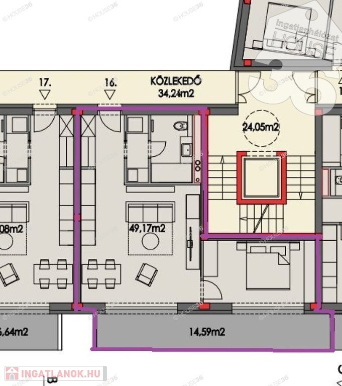 Az épület II. emeletén, 49,17 m2 lakóterű, nappali + 1 szobás lakás, 14,59 m2 erkéllyel megvásárolható.