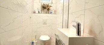 Igényes fürdőszoba káddal, zuhanyzóval és dupla mosdóval