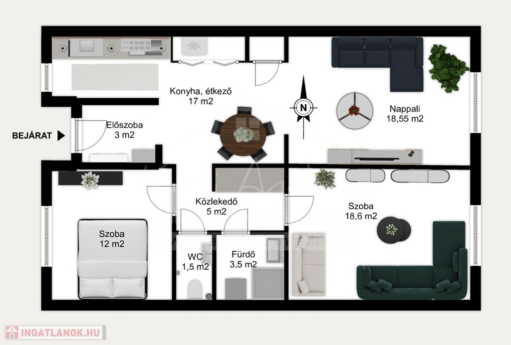 A lakás elrendezése: 1 amerikaikonyhás nappali, 1 előtér, közlekedő, 2 hálószoba, 1 fürdőszoba tusolóval, külön toalettel.