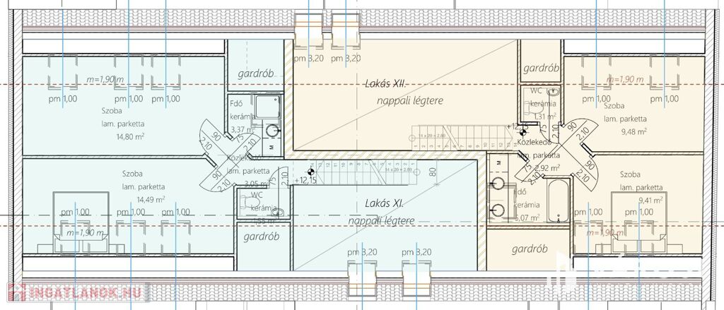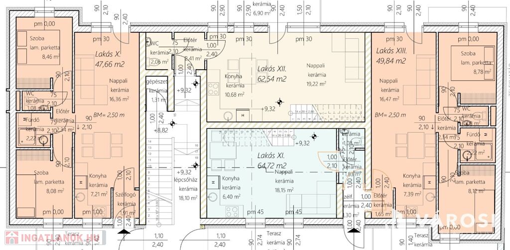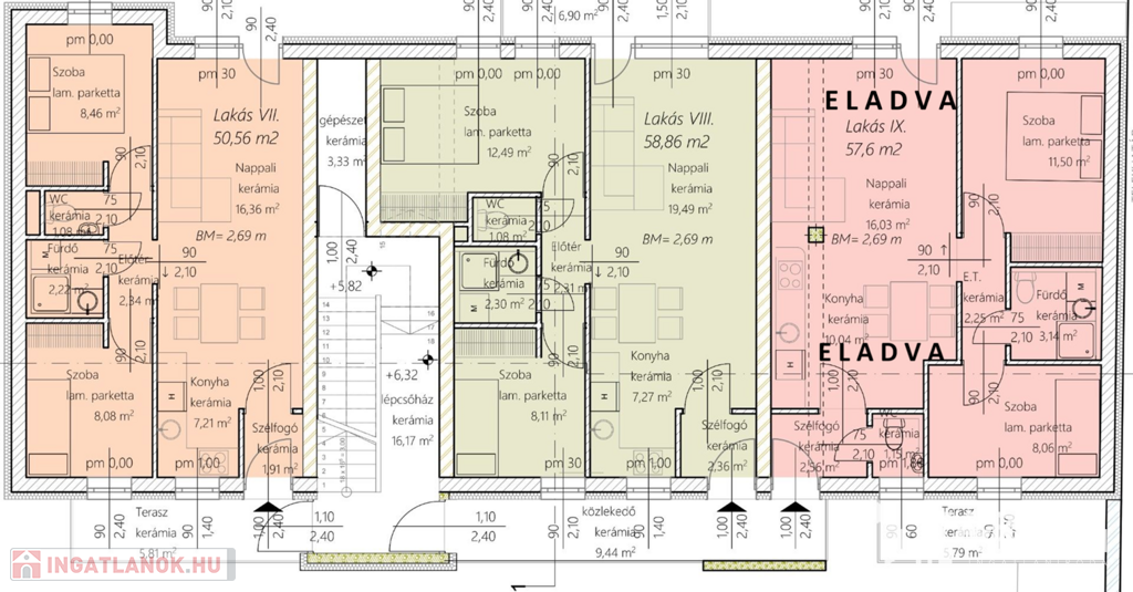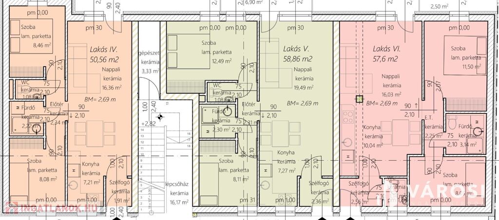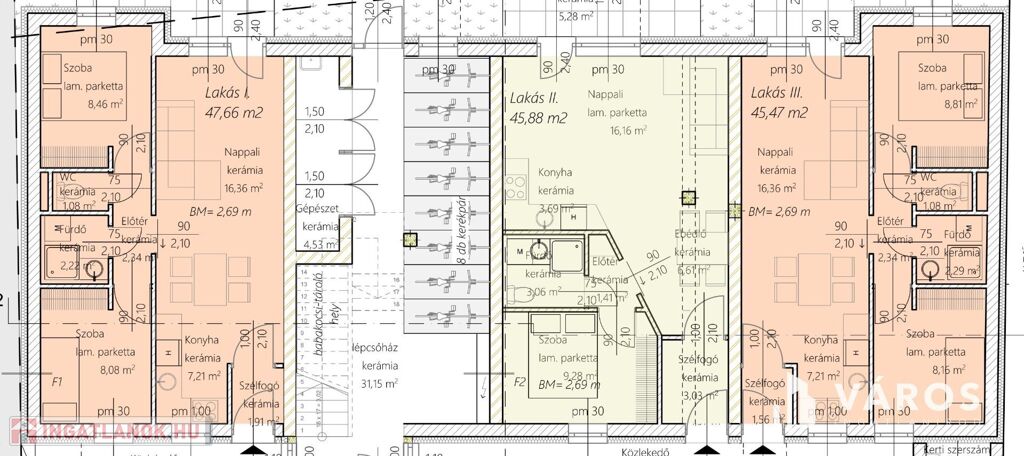 A lakások méretei, a legkisebb 45,47 m2, a legnagyobb 64,72 m2. 2026 januártól 5 % áremelés.