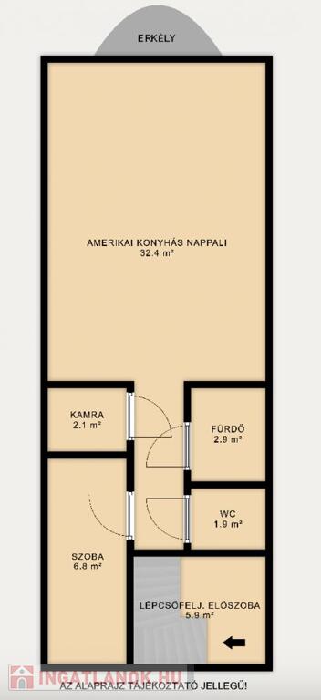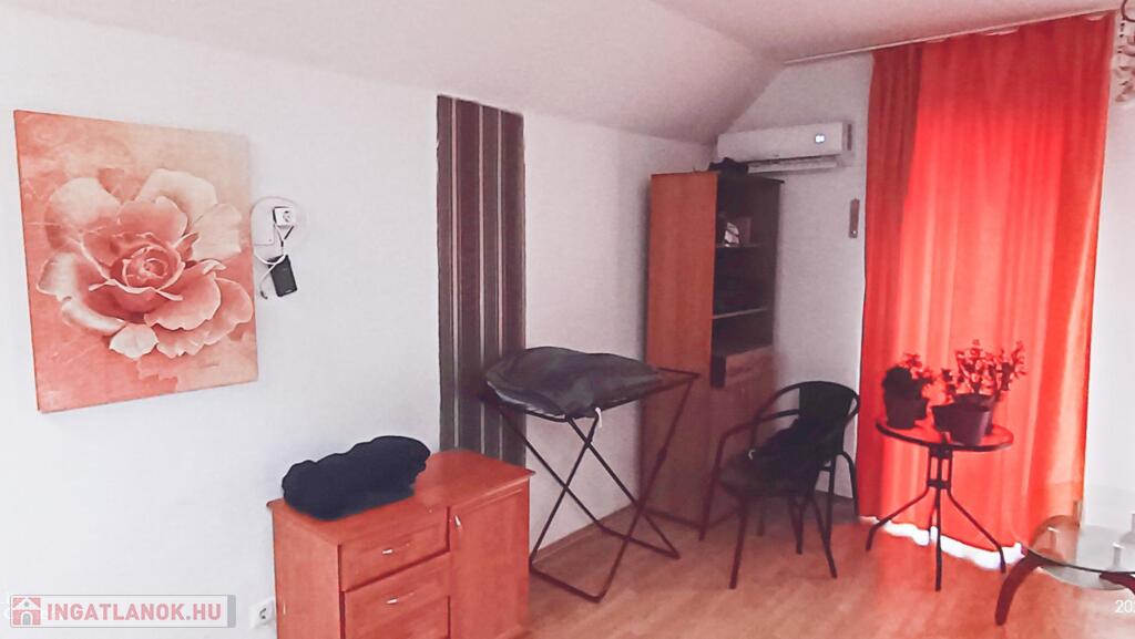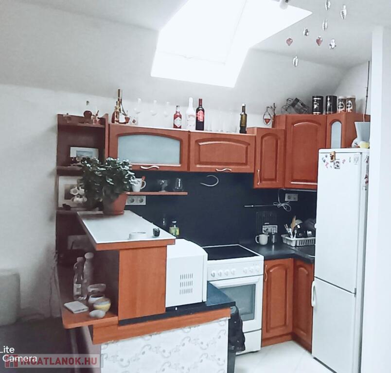Tetőtéri lakrész: Amerikai konyhás nappali, 1 hálószoba, sarokkádas fürdőszoba, külön WC, tárolóhelyiség