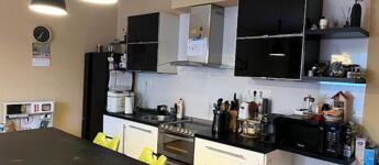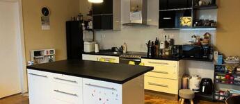 Az egyik nagyméretű (29,8 nm) szobában kapott helyet az amerikai konyhás nappali, konyhaszigettel.