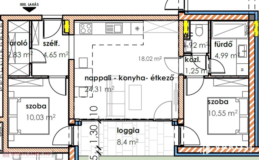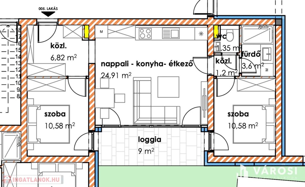 A 1 db amerikai konyhás nappalival, 1db hálószobával, 1 db fürdőszobával, közlekedővel, loggiával rendelkezik.