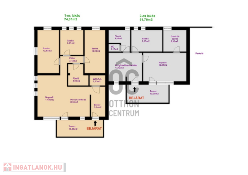 A nagyobb lakás nettó alapterülete: 74,3 m2