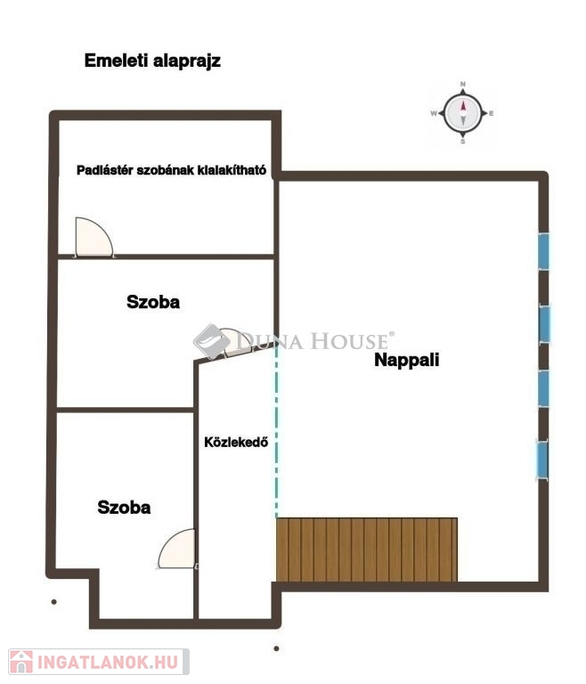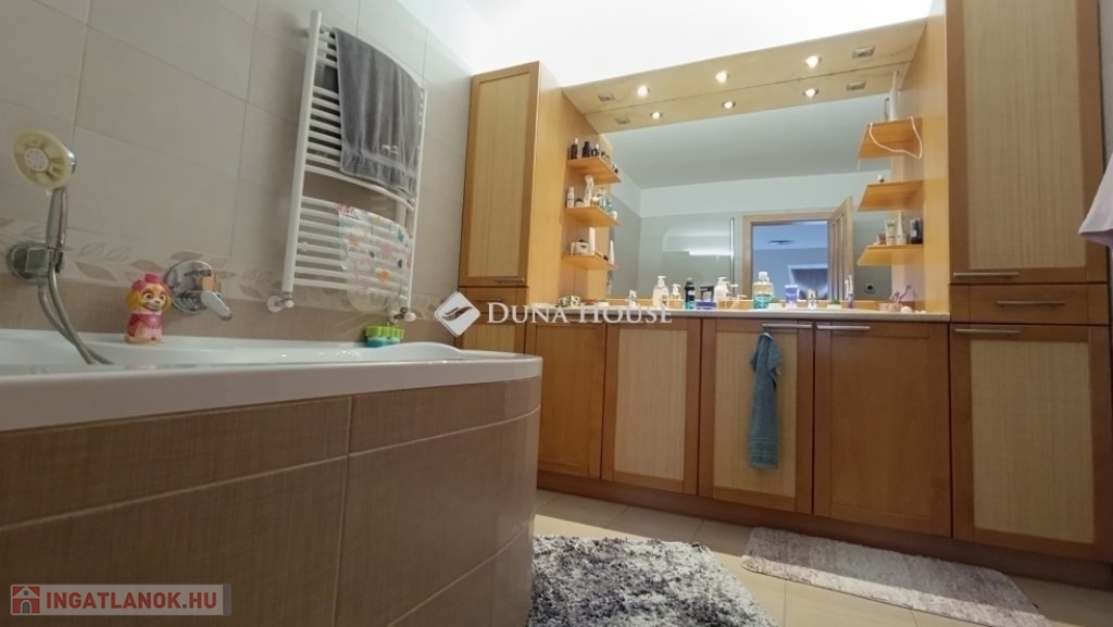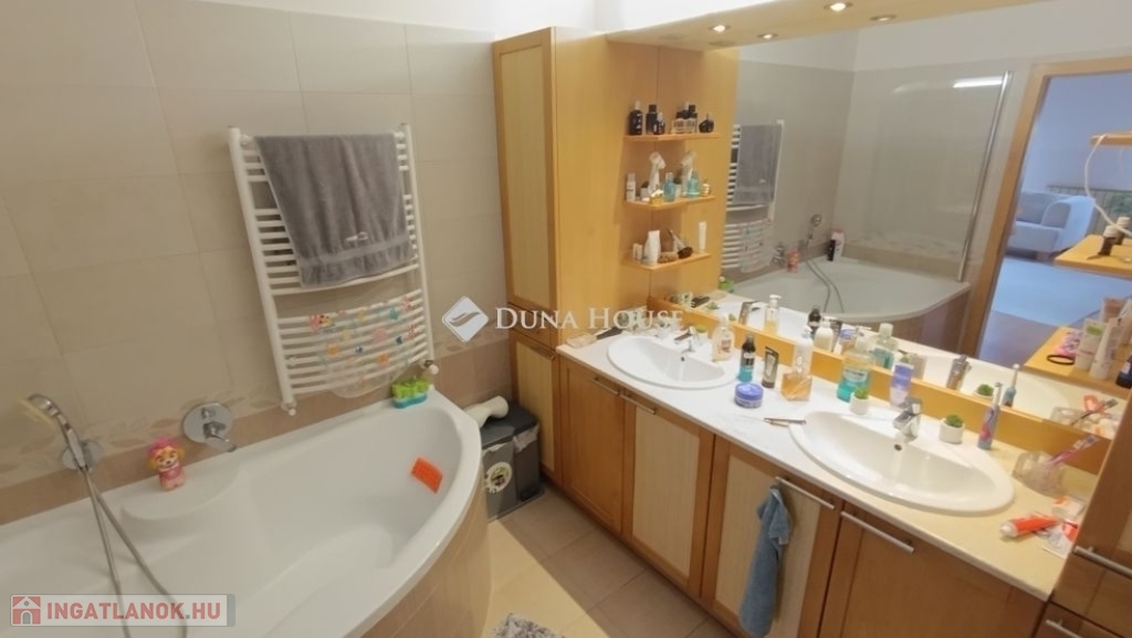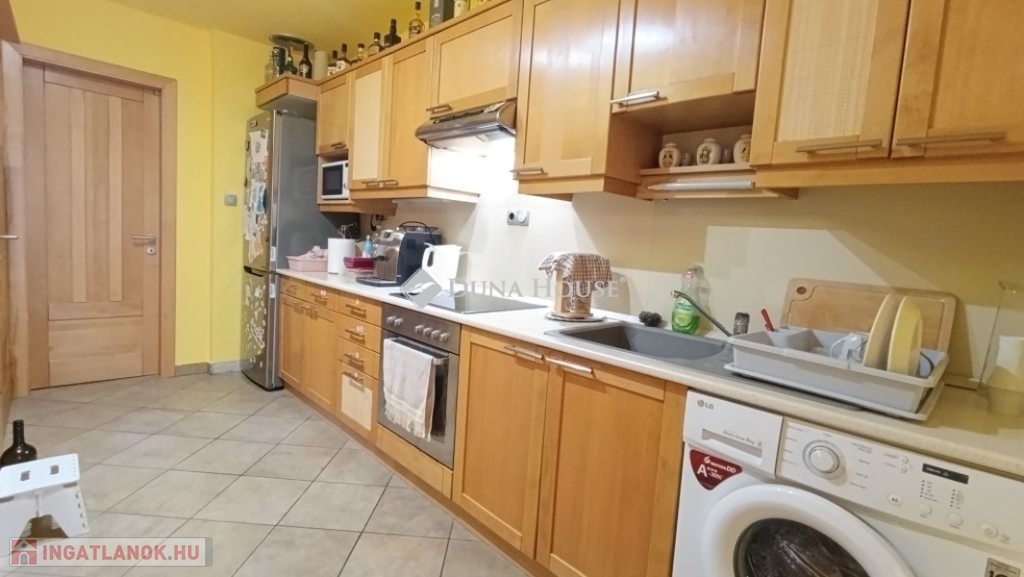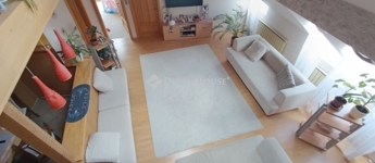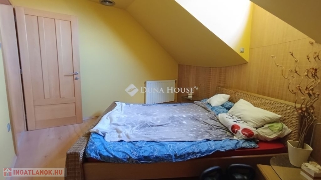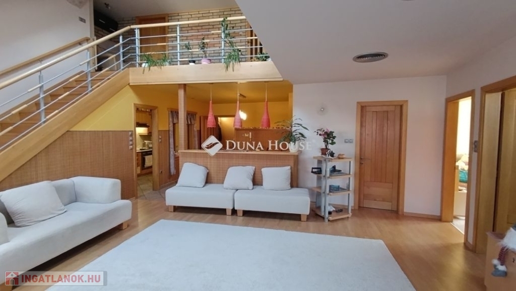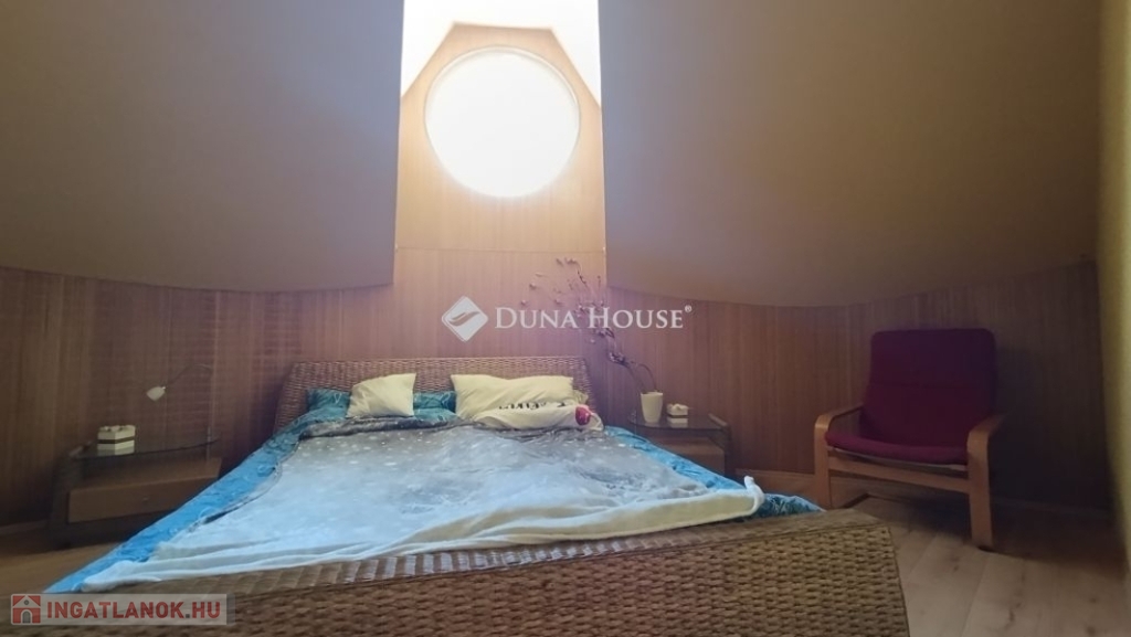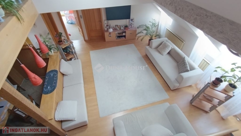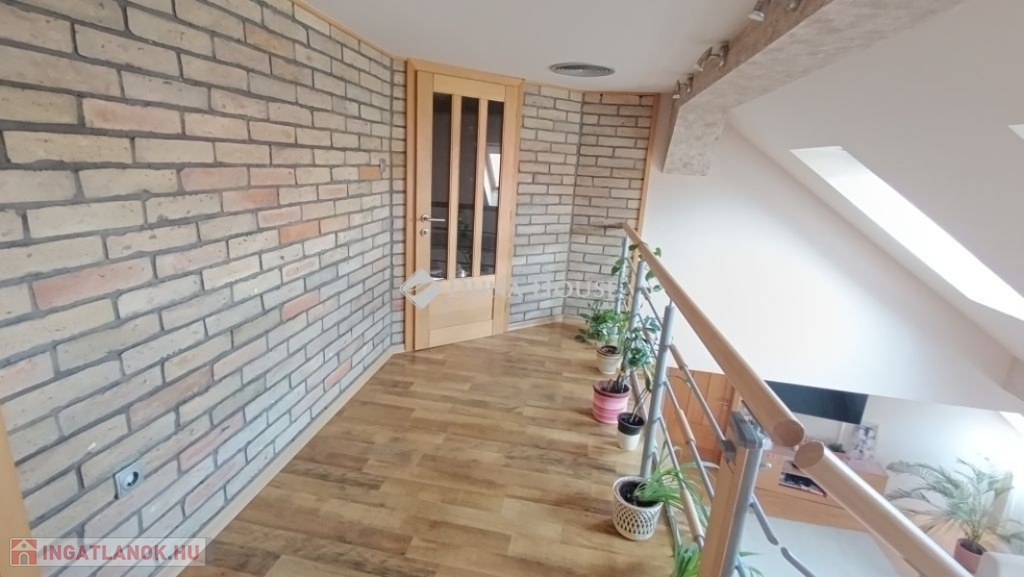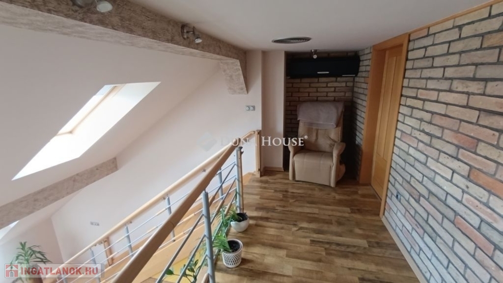Ahogy belépünk a lakásba kényelmesen bepakolhatunk egy egész falat elfoglaló praktikus beépített szekrénybe. Innen nyílik a a konyha, és az étkező amit egy pult választ el a hatalmas nappalitól. A nappali különleges belmagassága, bevilágító ablakai miatt napfényes különleges hangulatot áraszt. A fürdőszobában nagy sarokkád, és hangulatos fürdőszobabútor nagy tükörrel várja új tulajdonosát. A wc külön helyiségben van. A hálószoba körablaka extra megjelenést kölcsönöz a helyiségnek. A földszinten még egy szoba van. A hangulatos lépcsőn juthatunk fel a galériás emeleti helyiségekbe, itt két szoba van. A galérián kapott helyet a klíma is így kellemes hőmérsékletet biztosít nyáron is a lakásban.