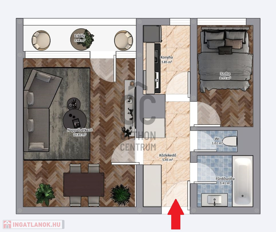 - Felosztása: közlekedő, konyha, fürdő, wc, hálószoba, nappali és az abból nyíló erkély.