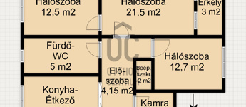 helyiségek: 3 hálószoba, ebből 2 szoba külön nyílik, konyha-étkező, közlekedő, kamra, fürdőszoba-WC