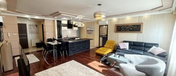 Tágas, világos nappali–étkező–konyha, gépesített, beépített mosogatógéppel ellátott modern konyhabútorral.