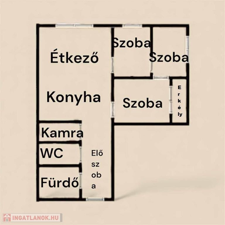 Elosztása: 3 szoba, nagy konyha, fürdőszoba, wc (külön helyiségben), közlekedő, beépített szekrény.