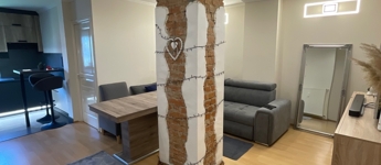 Elrendezés: nappali, konyha, étkező, 3 külön nyíló szoba, nagy műfű burkolatú erkély