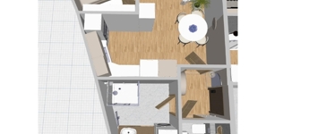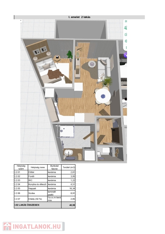 Ez a 37,74 nm²-es + 5,7 nm-és erkéllyel, első emeleti, nappali + 1 szobás elrendezéssel, konyha–étkezővel, fürdő-WC-vel és előtérrel rendelkezik.