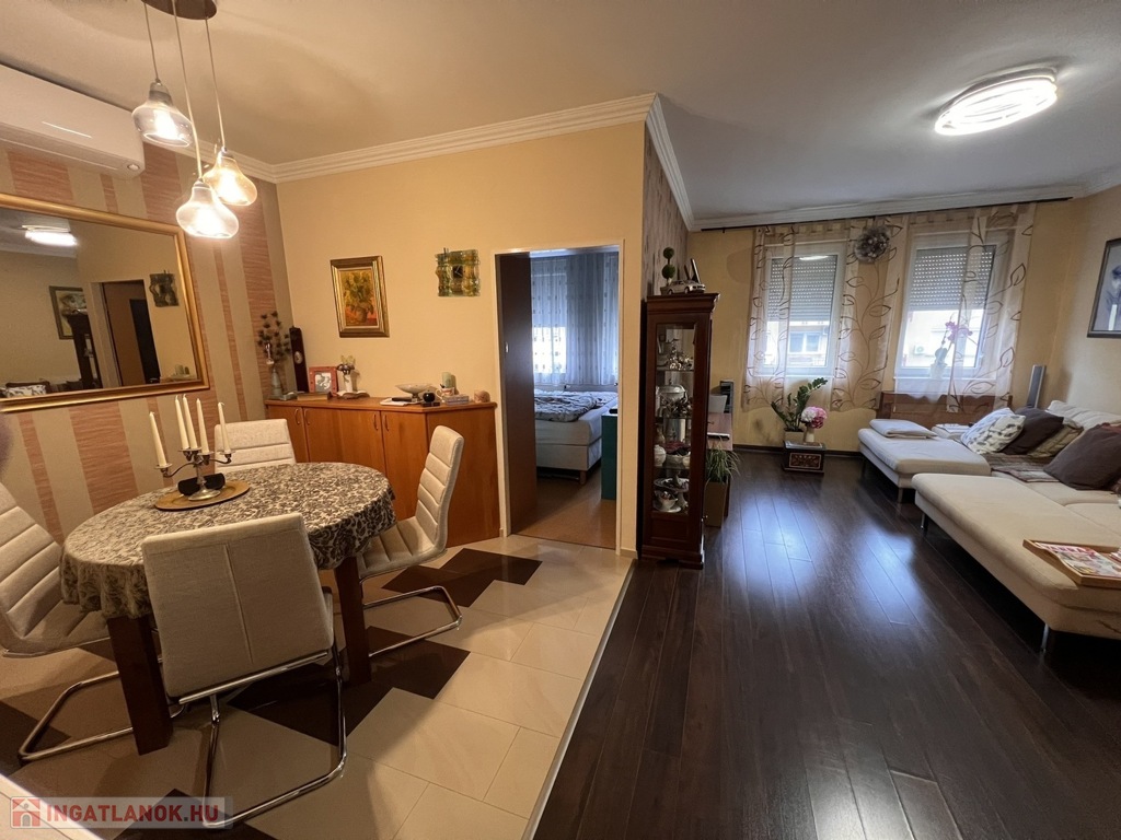 Az ingatlan jó állapotú, praktikus elosztásának köszönhetően ideális választás lehet fiatal pároknak, családoknak vagy akár befektetés céljára is. A lakás műanyag nyílászárókkal és redőnyökkel felszerelt, burkolatai igényesek, járólap és laminált padló kombinációjával. A beépített konyhabútor a vételár részét képezi. A fürdőszoba és a WC külön helyiségben található, ami a mindennapi kényelmet szolgálja. Az otthon melegéről egyedi gázfűtés gondoskodik, a kellemes hőmérsékletről pedig klímaberendezés is rendelkezésre áll.
