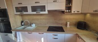 A konyhában egyedi gyártású, minőségi konyhaszekrény található, beépített gépekkel a vételár része