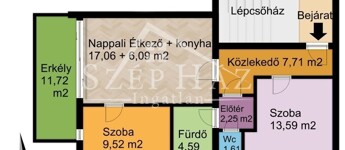 Elrendezés: amerikai konyhás nappali + 2 külön nyíló hálószoba