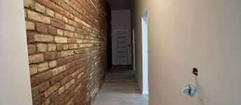 Különlegessége a folyosó teljes fala briliánsan kilátszó téglás, ami egyedi karaktert kölcsönöz a lakásnak.