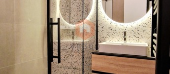 A fürdőszobák épület fölé kivezetett, álmennyezetbe süllyesztett páraelszívással rendelkeznek, falsíkba süllyesztett Geberit WC tartállyal.