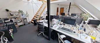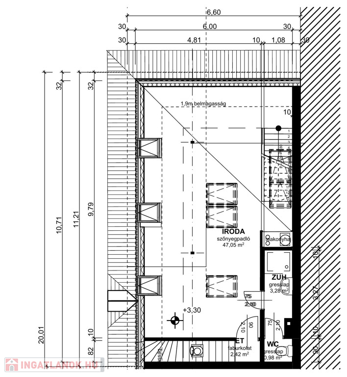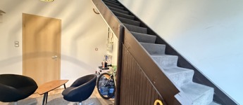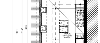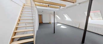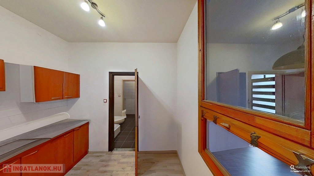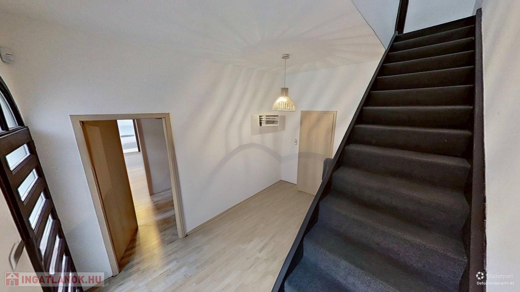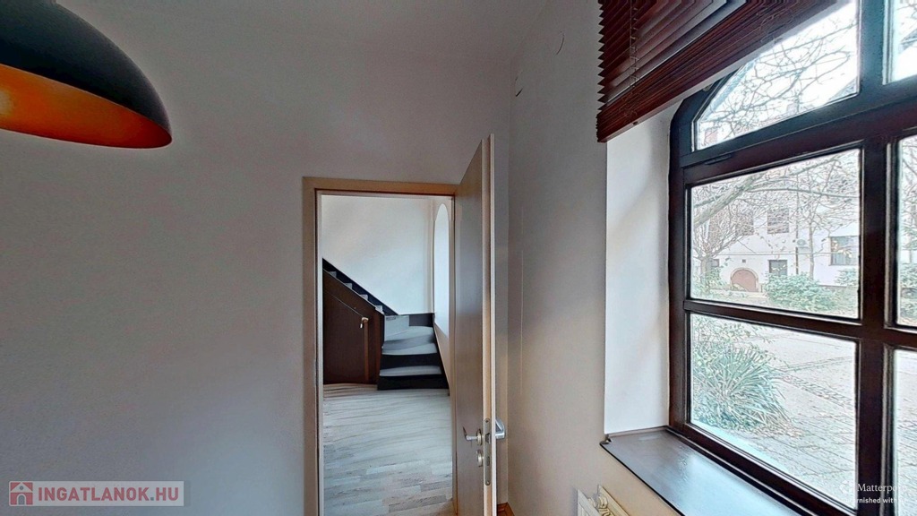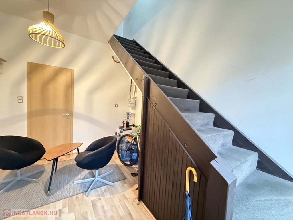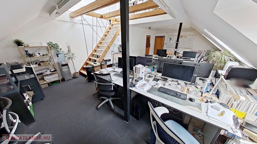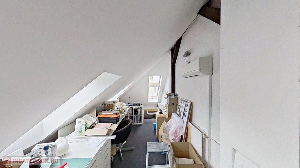 Az előtérből a lépcsőn felfelé indulva találjuk a fenti, nagyobb lakrészt, ahova belépve egy hatalmas, egy légterű, jelenleg irodaként működő helyiségben találjuk magunkat. Ebben a légtérben a tetőtérbe vezető lépcső alatt lett kialakítva egy praktikus kis konyharész. Ebből a légtérből nyílik a fürdő/wc is. Egy szépen kivitelezett fa lépcsőn tudunk a tetőtérbe feljutni, mely akár egy elszeparált külön egység (iroda, háló) is lehet. Ez a felső lakrész is lehetőséget kínál egy önálló lakás kialakítására, a nagy légterű irodarészt akár több szobává is át lehet alakítani.