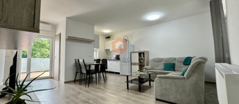 A lakás nyugati fekvésű, világos, teljesen bútorozott és gépesített, valamint klímával felszerelt. A tágas nappalihoz egy 13 m²-es, kényelmes terasz is tartozik, amely ideális kikapcsolódásra vagy tanulásra. A fürdőszoba és a WC külön helyiségben található.